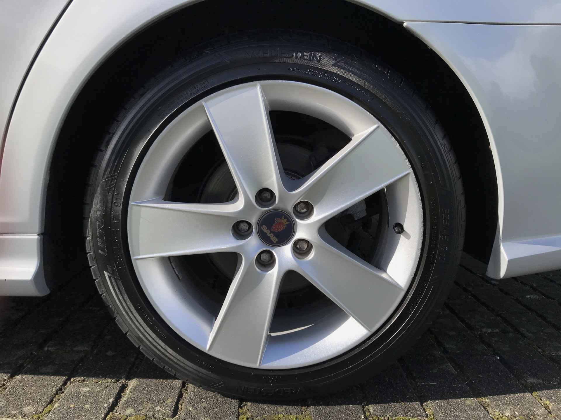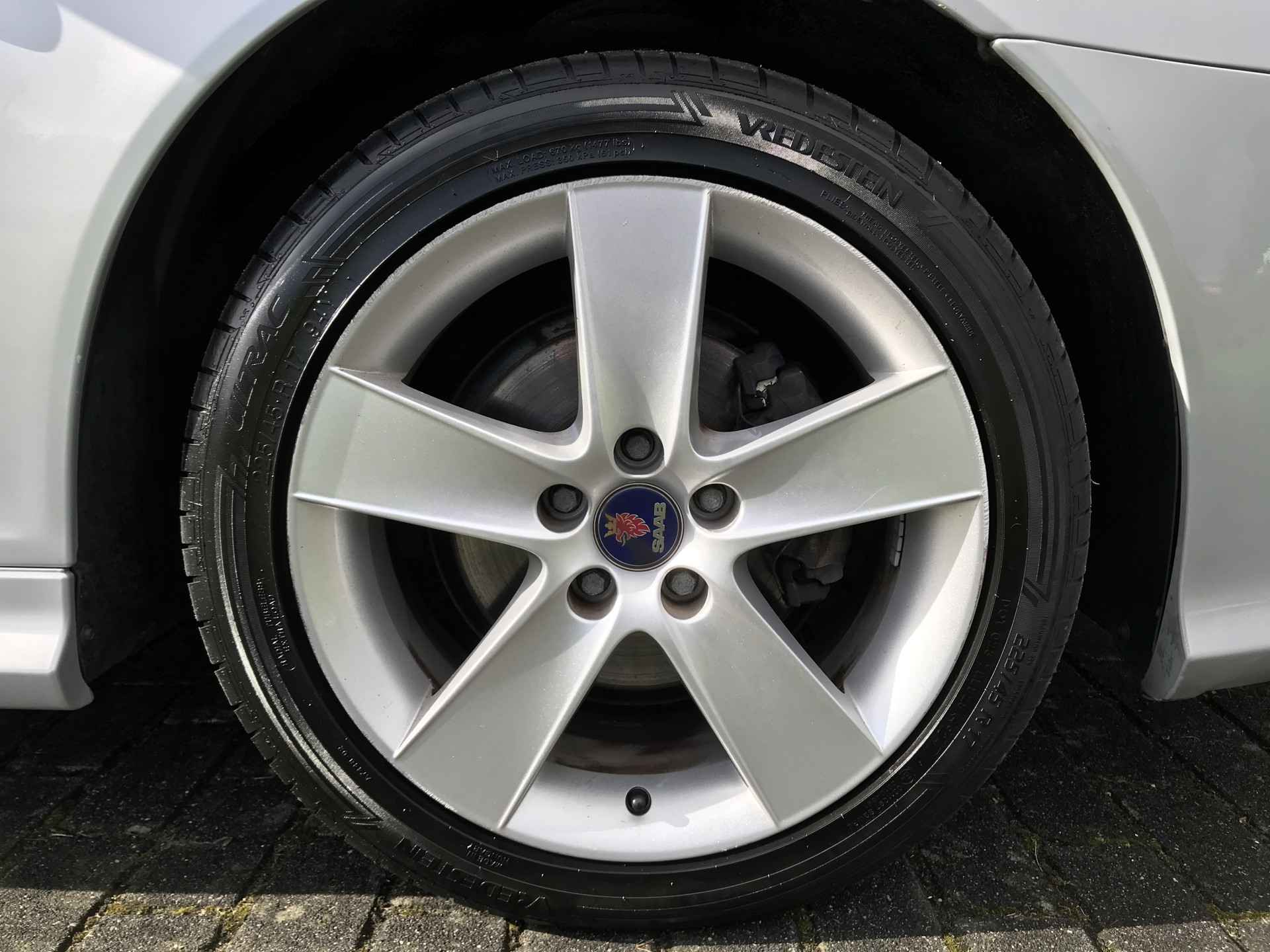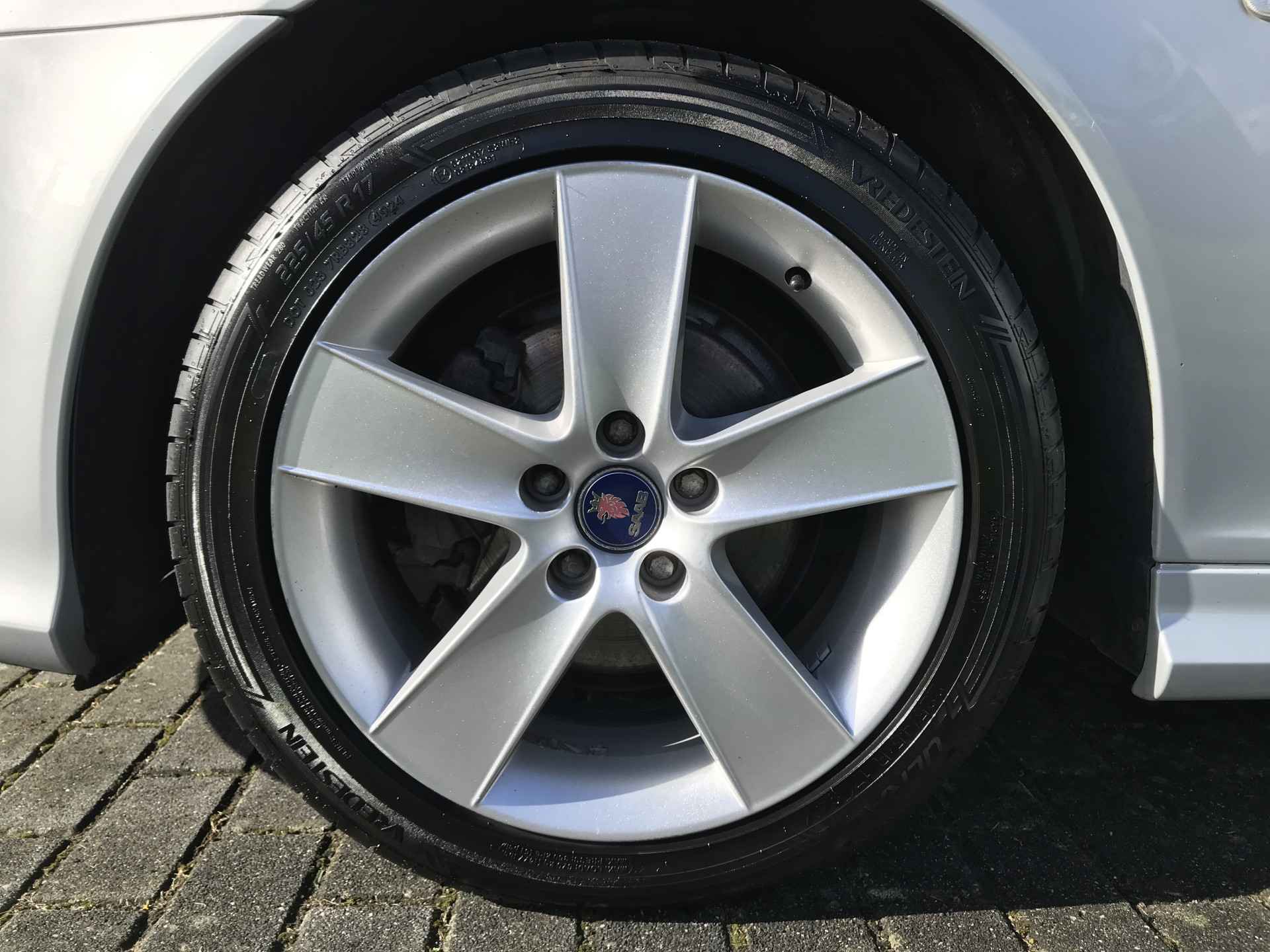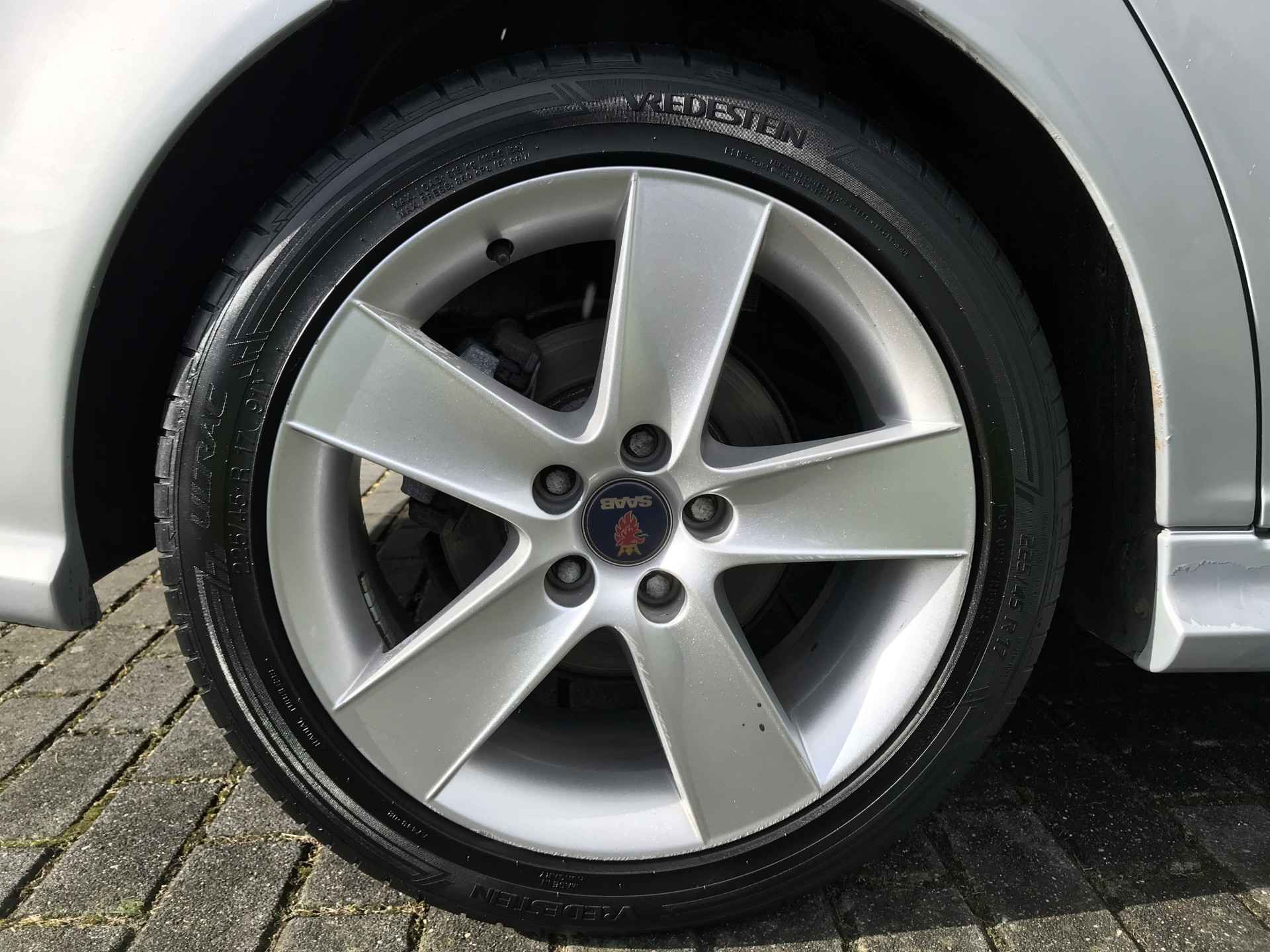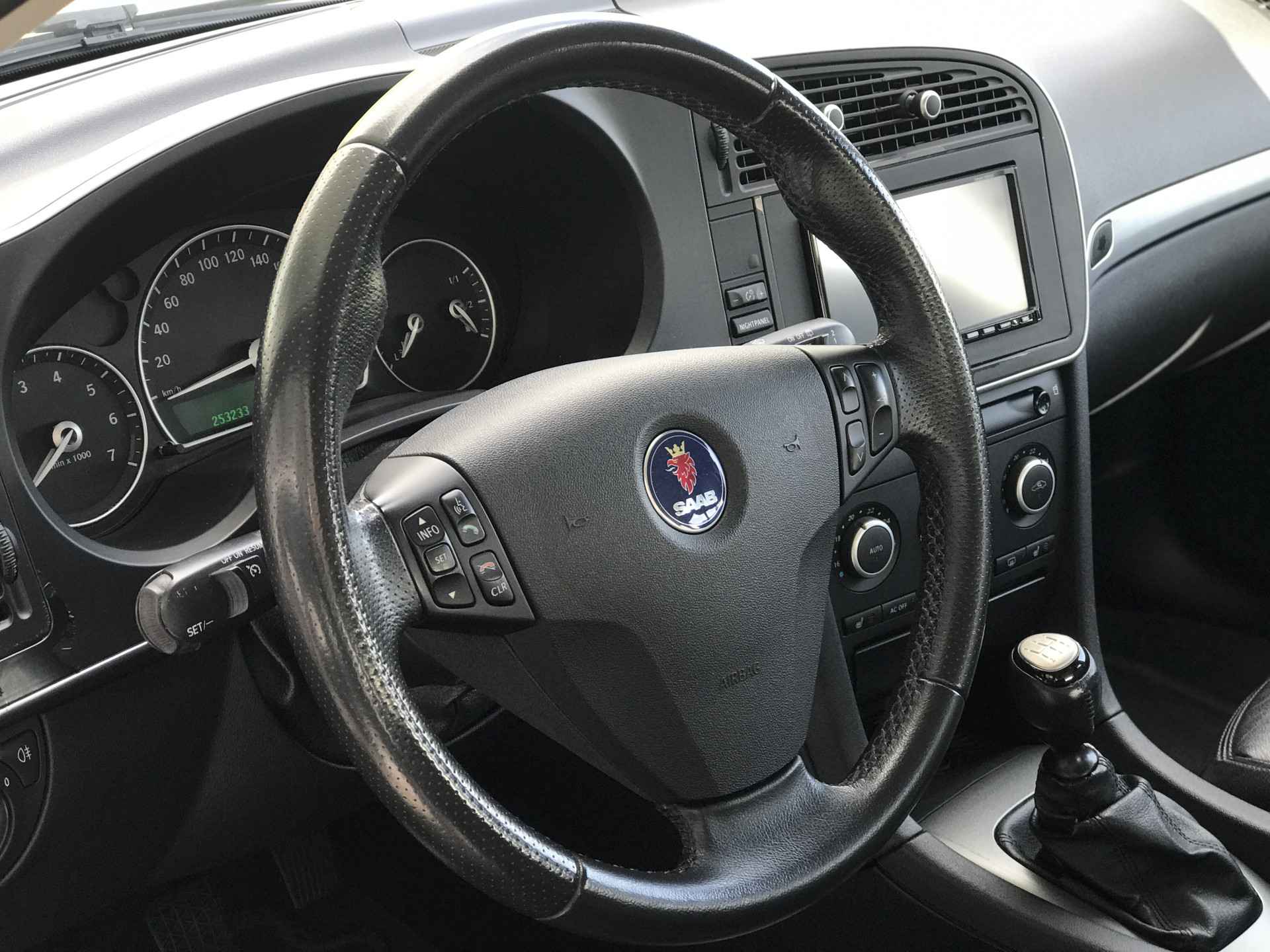 Saab 9-3 Sport Estate 1.8t Norden uitvoering van modeljaar 2008 voorzien van onder andere mistlampen voor, 17 inch lichtmetalen velgen, cruise control, climate control, xenon verlichting, parkeersensoren achter, verwarmbare voorstoelen, elektrisch bedienbare ramen, vaste trekhaak, volledig lederen bekleding, Kenwood navigatiesysteem en automatisch dimmende binnenspiegel. Prima onderhouden, boekjes ter inzage. Bij ons in onderhoud vanaf 2015 met 91.000 km. Onlangs voorzien van nieuwe brandstofpomp.