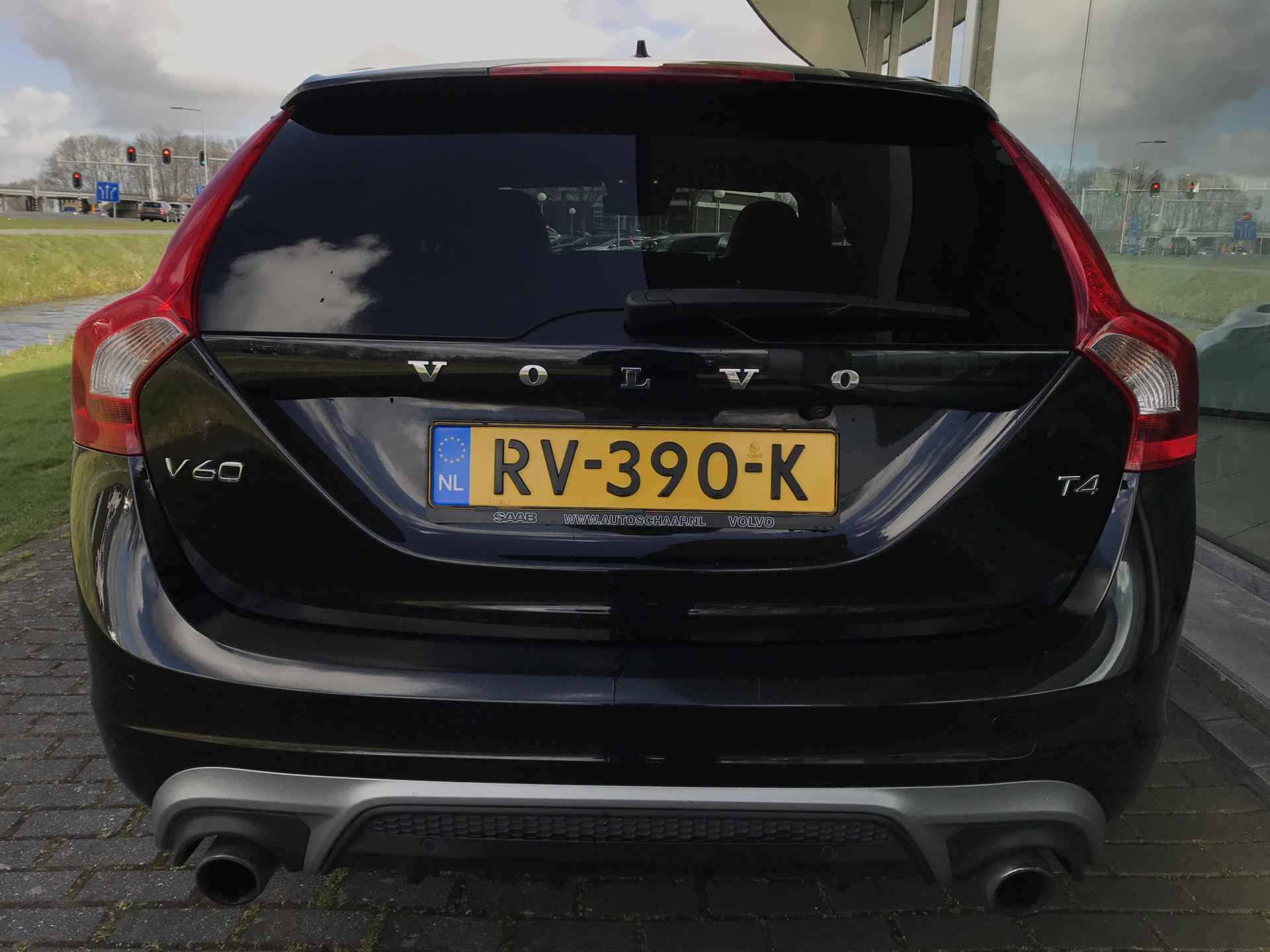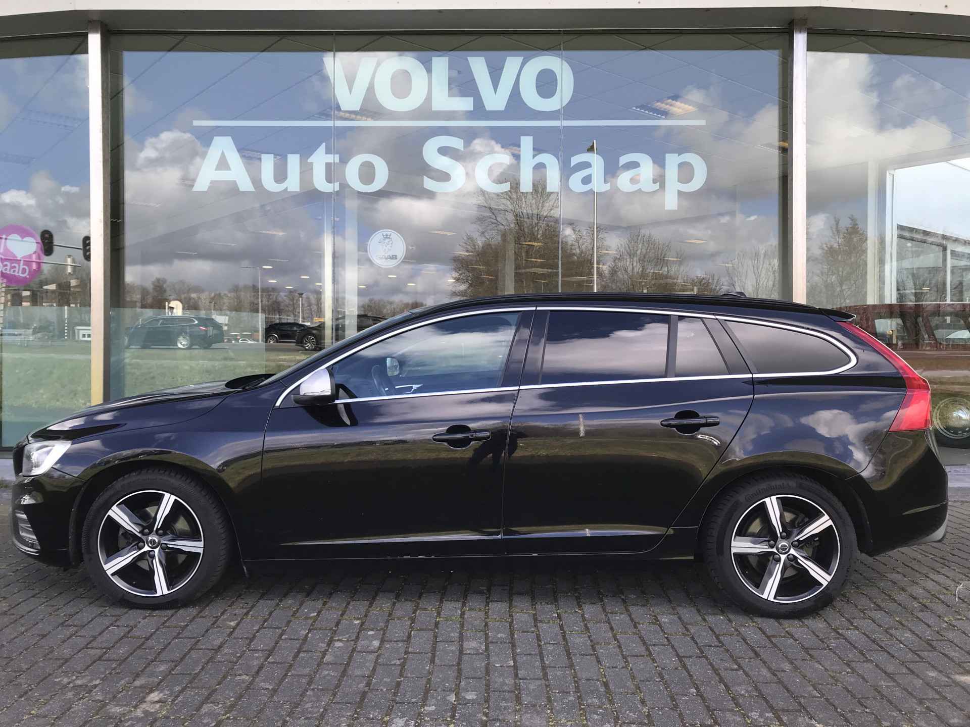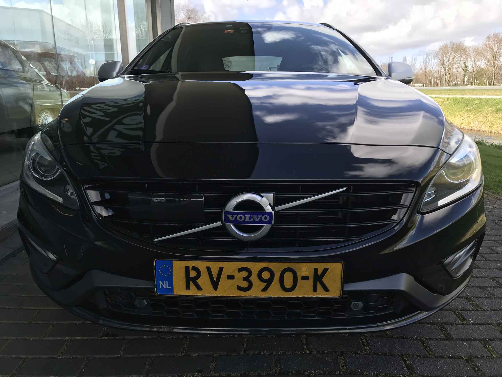 Volvo V60 2.0 T4 Polar+ Sport (R-Design) Automaat in de kleur Onyx Black metallic. Voorzien van onder andere parkeersensoren voor en achter met camera, meesturende bi-xenon koplampen, adaptieve cruise control, standkachel, keyless entry, donker getint glas achter, verwarmbare voorstoelen, achterbank en stuurwiel, zwarte hemelbekleding, climate control, start/stop systeem en actief groot licht functie. Voornamelijk Volvo dealer onderhouden, boekjes ter inzage.